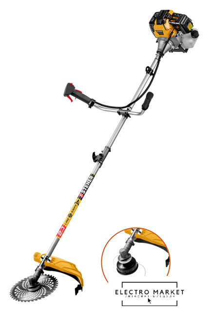 бензиновый, двухтактный, 850 Вт, оснастка: леска+металлический нож+металлический диск, ширина скашивания: 44 см, 6.5 кг