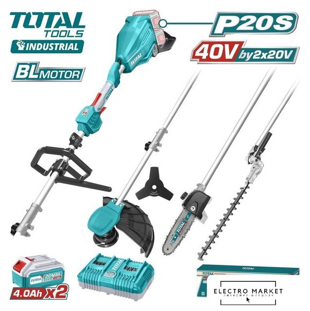 | Комплектация | - Корпус с бесщеточным двигателем - 1 шт.- Насадка-триммера TATLI4012 - 1 шт.- Насадка-кусторез TATLI4013 - 1 шт.- Насадка-высоторез TATLI4014 - 1 шт.- Аккумулятор TFBLI20021 4,0 Ач - 2 шт.- Зарядное устройство TCLI2034 на 2 аккумулятора - 1 шт.- Триммерная головка с леской 5 м - 1 шт.- Нож трехлопостной 255 мм - 1 шт.- Цепь 8'' - 1 шт.- Шина 8'' - 1 шт.- Чехол для шины - 1 шт.- Чехол для ножа кустореза - 1 шт.- Плечевой ремень - 1 шт.- Шестигранный ключ - 2 шт.- Гаечный ключ - 2 шт.- Инструкция- Коробка |