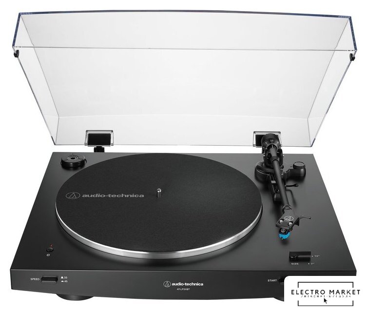 прямой привод, 33 1/3, 45 об/мин, электронное переключение скоростей, встроенный фонокорректор, тонарм поворотный (изогнутый), картридж с подвижным магнитом (MM), цвет черный