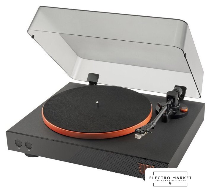 ременной привод, 33 1/3, 45 об/мин, электронное переключение скоростей, встроенный фонокорректор, тонарм поворотный (прямой), картридж с подвижным магнитом (MM), цвет черный
