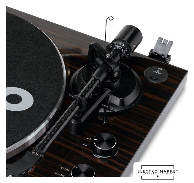 ременной привод, 33 1/3, 45 и 78 об/мин, электронное переключение скоростей, встроенный фонокорректор, тонарм поворотный (изогнутый), картридж с подвижным магнитом (MM), цвет черный