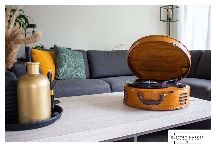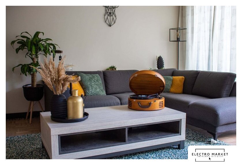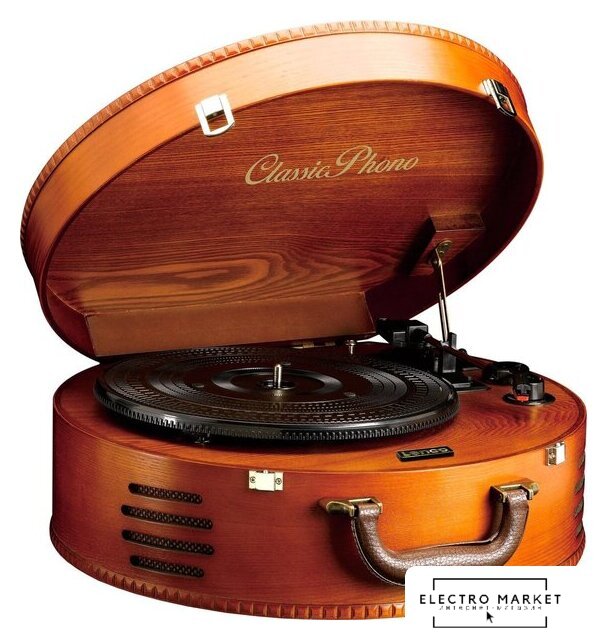 ременной привод, 33 1/3, 45 об/мин, электронное переключение скоростей, встроенный фонокорректор, тонарм поворотный (прямой), картридж с подвижным магнитом (MM), цвет коричневый/серый
