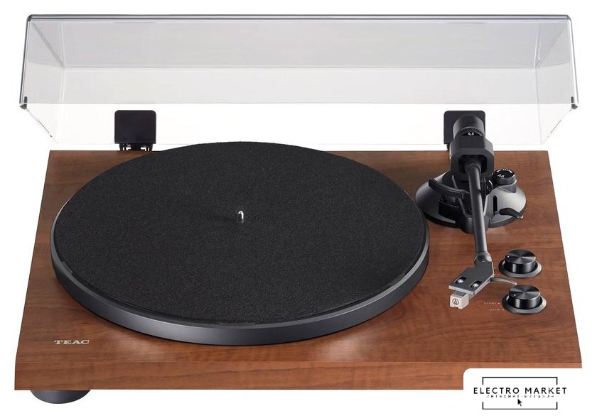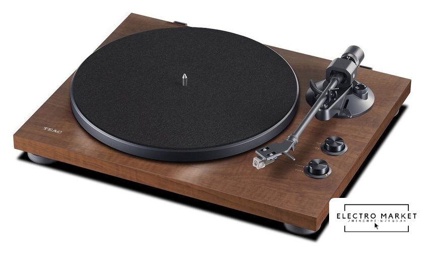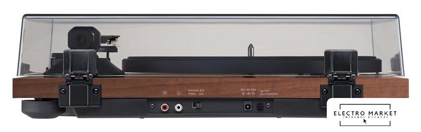 ременной привод, 33 1/3, 45 об/мин, электронное переключение скоростей, встроенный фонокорректор, тонарм поворотный (прямой), картридж с подвижным магнитом (MM), цвет коричневый