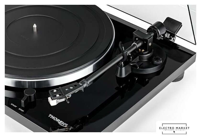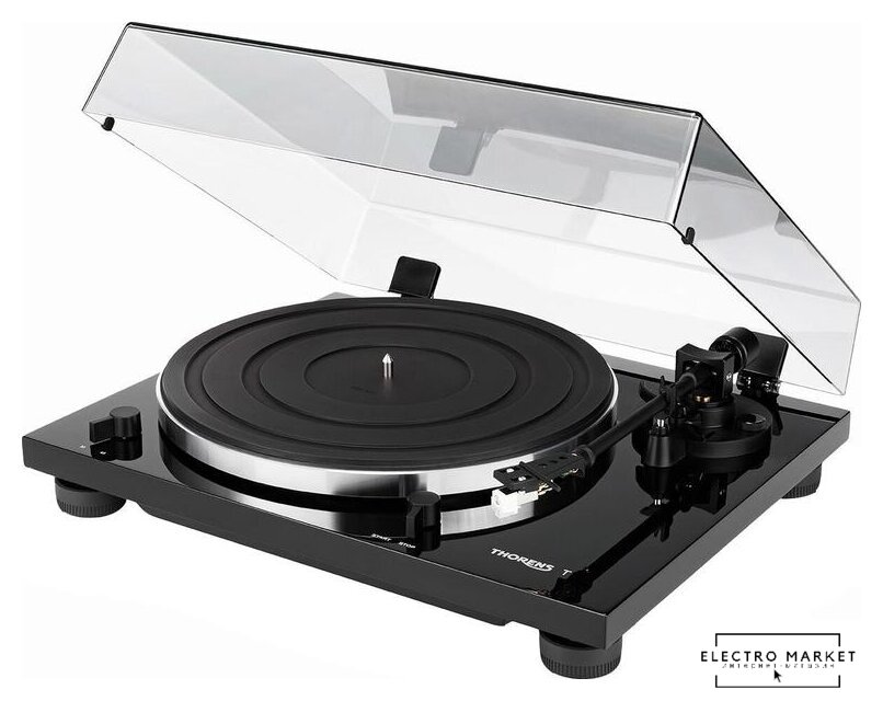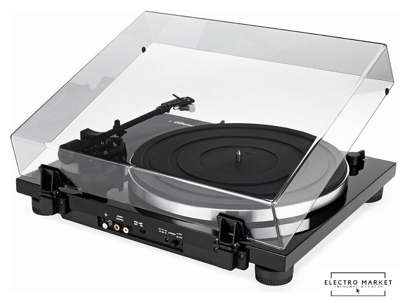 ременной привод, 33 1/3, 45 об/мин, электронное переключение скоростей, встроенный фонокорректор, тонарм поворотный (прямой), картридж с подвижным магнитом (MM), цвет черный