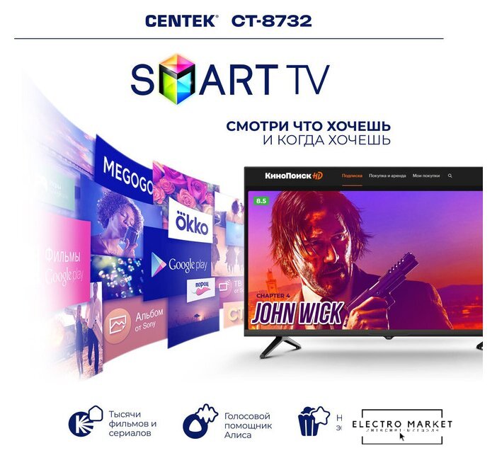32" 1366x768 (HD), частота матрицы 60 Гц, Smart TV (Яндекс.ТВ), Wi-Fi, смарт пульт