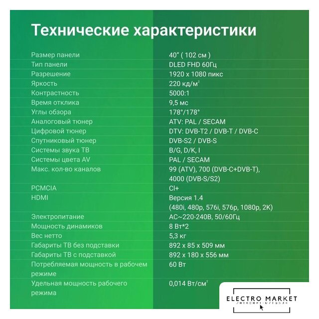 | ТВ-тюнер | аналоговый, DVB-C, DVB-T, DVB-T2, DVB-S/S2 |