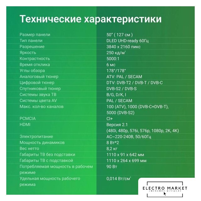 50" 3840x2160 (4K UHD), матрица VA, Smart TV (Триколор ТВ), HDR, Wi-Fi