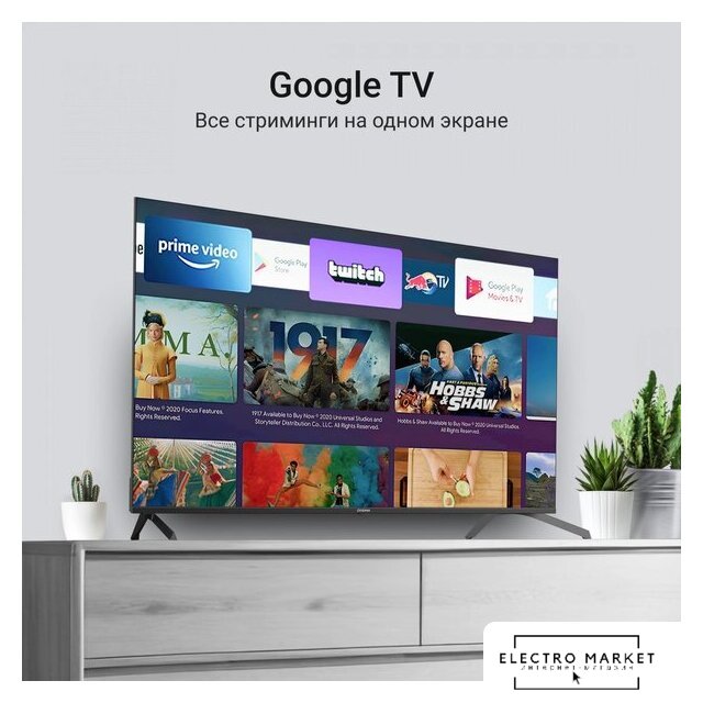 65" 3840x2160 (4K UHD), матрица VA, частота матрицы 60 Гц, Smart TV (Google TV), HDR10+, HLG, Dolby Atmos, Wi-Fi, смарт пульт