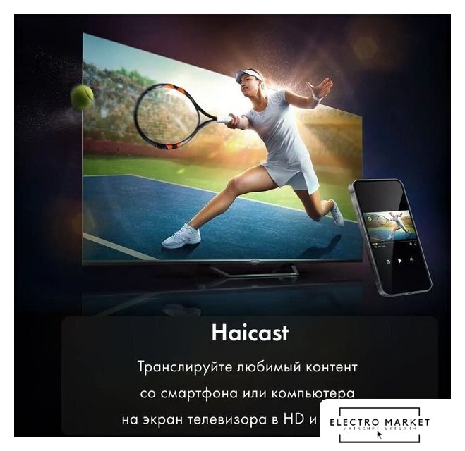 75" 3840x2160 (4K UHD), матрица IPS, частота матрицы 60 Гц, Smart TV (Vidaa), HDR10, HDR10+, Dolby Vision, HLG, DTS:X, Dolby Atmos, AirPlay, Wi-Fi, смарт пульт