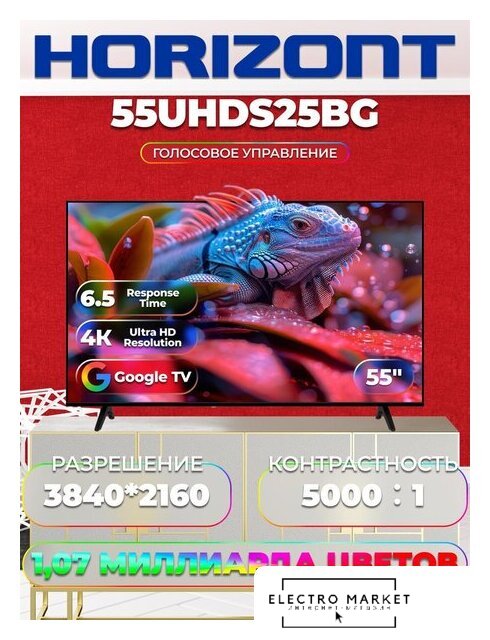 55" 3840x2160 (4K UHD), матрица VA, частота матрицы 60 Гц, Smart TV (Яндекс.ТВ), HDR10, Wi-Fi, смарт пульт