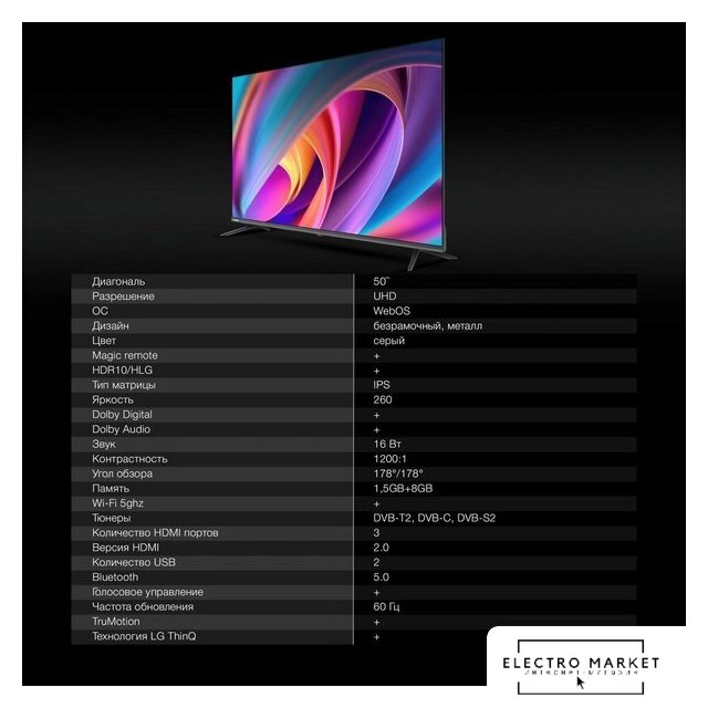 55" 3840x2160 (4K UHD), частота матрицы 60 Гц, HDR10, HDR10+, Dolby Vision, HLG, Dolby Atmos, Wi-Fi, смарт пульт