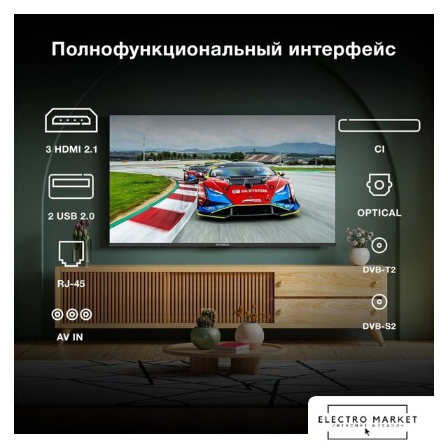 55" 3840x2160 (4K UHD), матрица VA, частота матрицы 60 Гц, Smart TV (Салют ТВ), HDR10, HLG, AirPlay, Wi-Fi, смарт пульт