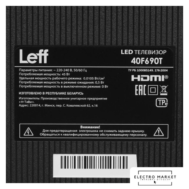 40" 1920x1080 (Full HD), матрица VA, частота матрицы 60 Гц, Smart TV (Android TV), HLG, Wi-Fi, смарт пульт