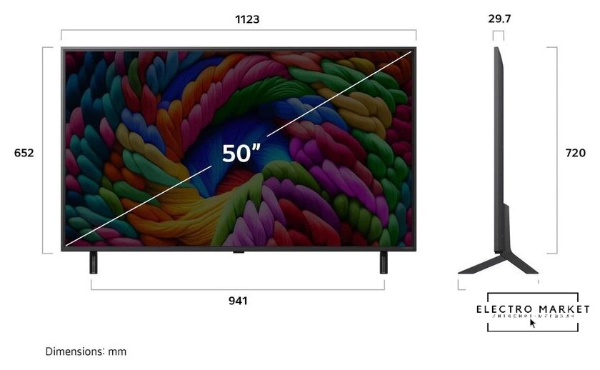 50" 3840x2160 (4K UHD), частота матрицы 60 Гц, Smart TV (LG webOS), HDR10, HLG, AirPlay, Wi-Fi, смарт пульт