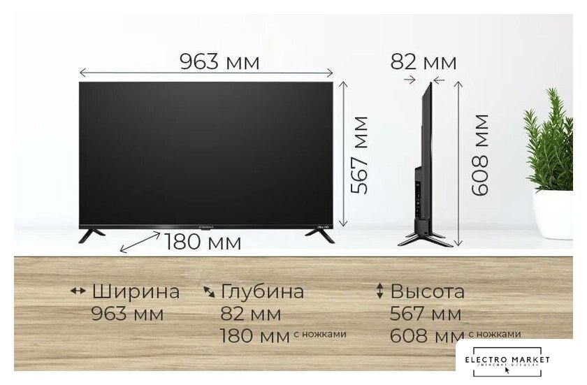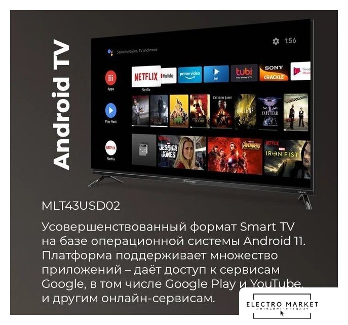 43" 3840x2160 (4K UHD), частота матрицы 60 Гц, Smart TV (Android TV), HDR10, HLG, DTS:HD, DTS:X, Wi-Fi, смарт пульт