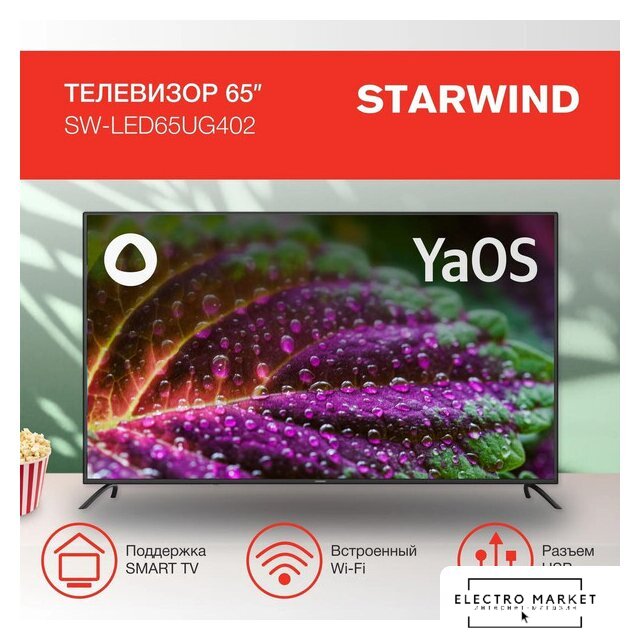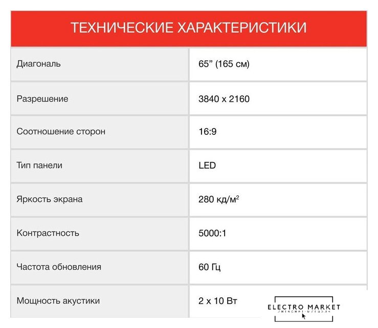 65" 3840x2160 (4K UHD), частота матрицы 60 Гц, Smart TV (Салют ТВ), HDR10, Wi-Fi, смарт пульт