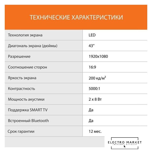 50" 3840x2160 (4K UHD), матрица VA, частота матрицы 60 Гц, Smart TV (Android TV), Wi-Fi, смарт пульт