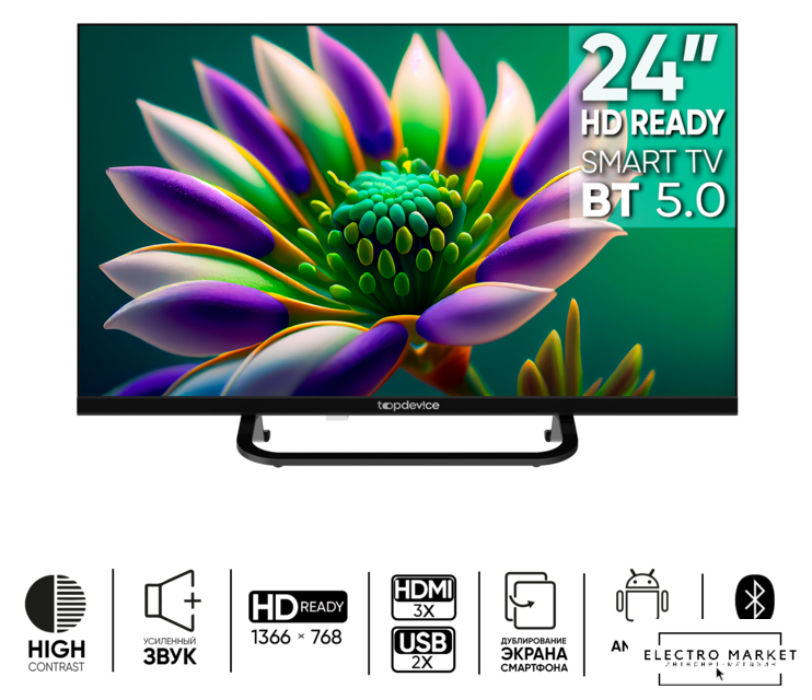 24" 1366x768 (HD), частота матрицы 60 Гц, Smart TV (Яндекс.ТВ), Wi-Fi