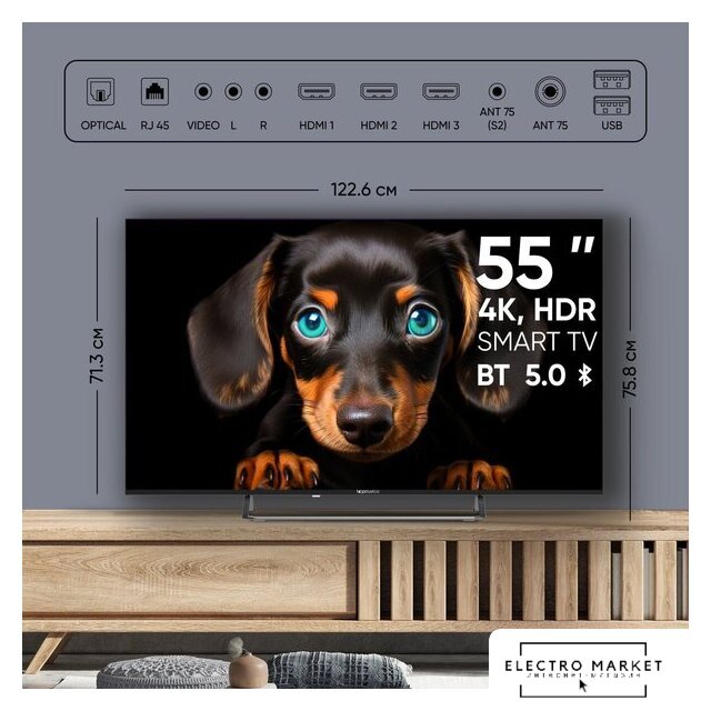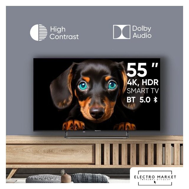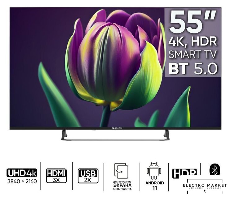 55" 3840x2160 (4K UHD), матрица VA, частота матрицы 60 Гц, Smart TV (Google TV), HDR10, HLG, AirPlay, Wi-Fi, смарт пульт