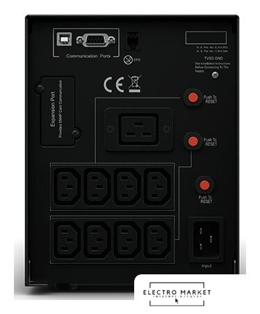 1200 Вт, line-interactive, 6 розеток IEC320-C13, время автономного питания: до 1 мин (1 мин 22 сек при 100% нагрузке; 7 мин 41 сек при 50% нагрузке)