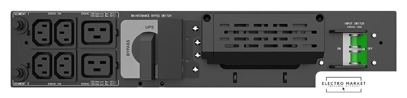 6000 Вт, online, 10 розеток IEC320-C13/IEC320-C19/клеммы, время автономного питания: до 4.4 мин (при полной нагрузке, 13 мин - при половинной нагрузке)