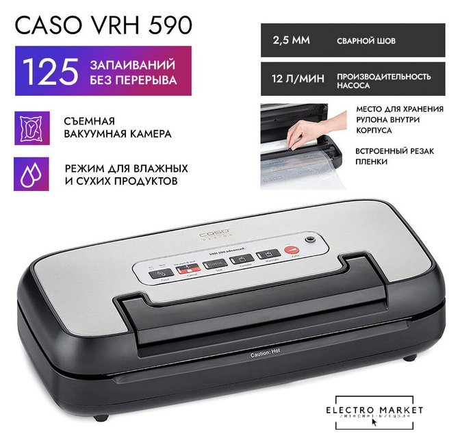 бескамерный, 110 Вт, 12 л/мин, пакет/пленка, рулон/контейнер, нержавеющая сталь/черный