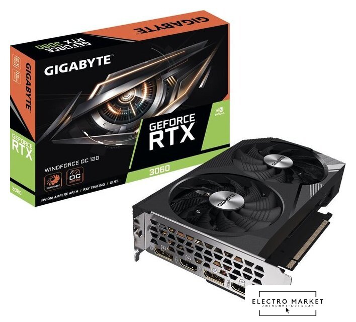 NVIDIA GeForce RTX 3060, базовая частота 1320 МГц, макс. частота 1807 МГц, 3584sp, частота памяти 15000 МГц, 192 бит, доп. питание: 8 pin, 2 слота, HDMI, DisplayPort