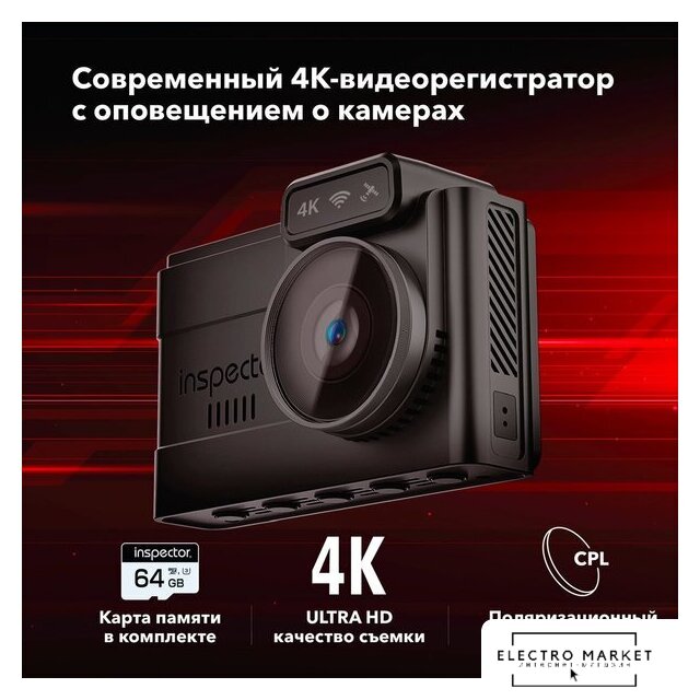 | Комплектация | - Видеорегистратор;- Карта памяти MicroSDXC INSPECTOR 64Gb (установлена в видеорегистратор);- Магнитное крепление на 3М-скотче;- Доп. часть крепления на присоске;- Доп. 3М-скотч для крепления;- Статическая пленка для лобового стекла (2 шт.);- USB Type-C кабель питания в прикуриватель;- Инструкция по эксплуатации;- Гарантийный талон;- Поляризационный фильтр CPL. |
