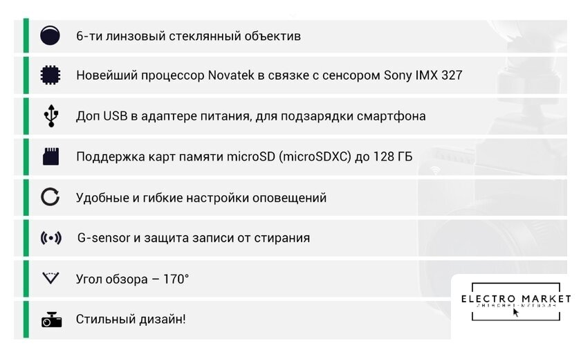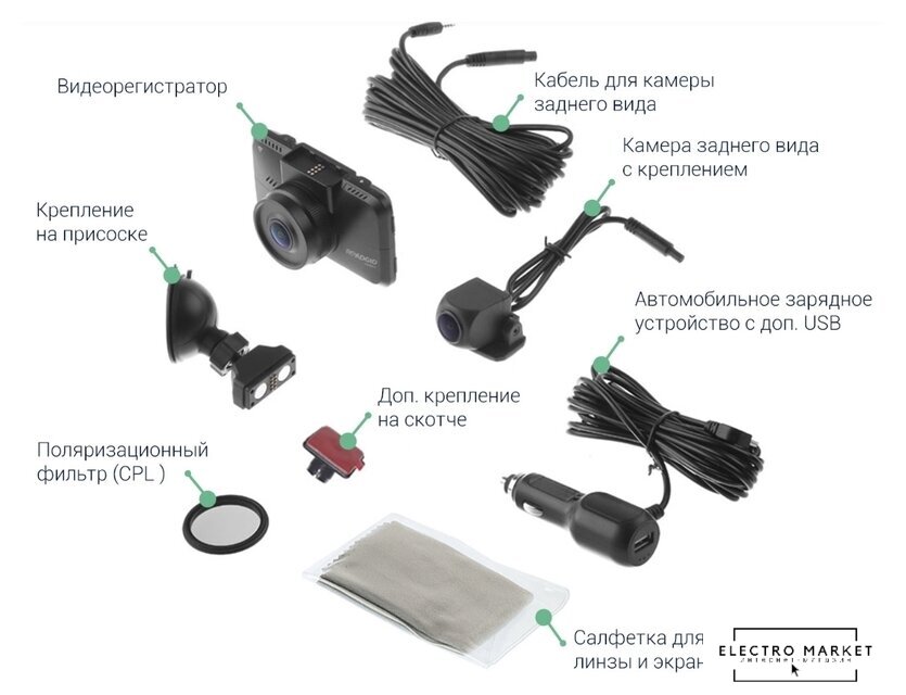 Комплектация | - видеорегистратор;- камера заднего вида с креплением;- кабель для камеры заднего вида;- поляризационный фильтр (CPL);- крепление на присоске;- доп. крепление на 3М скотче;- автомобильное зарядное устройство;- салфетка для линзы и экрана. |