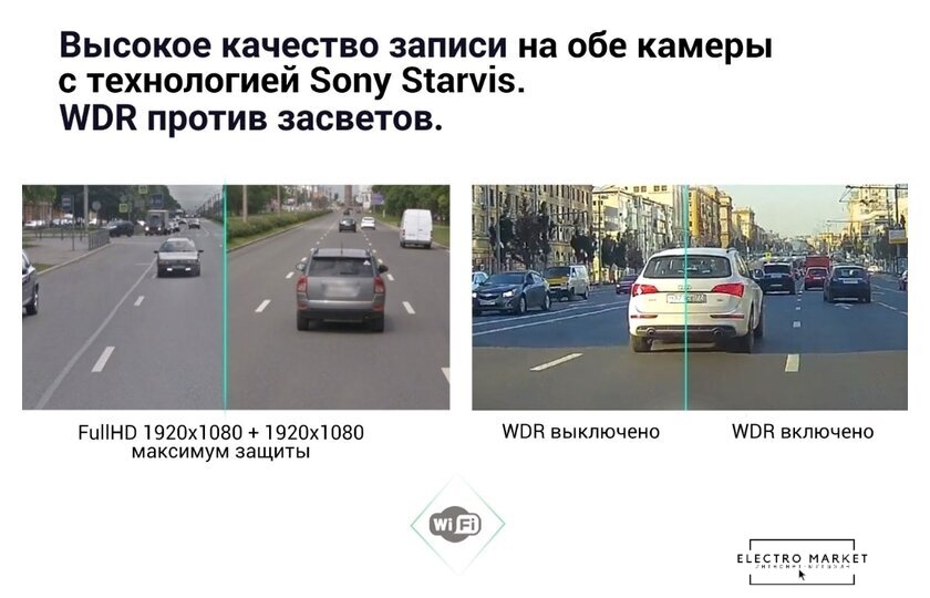 основная камера: 3.6 Мп 145°, вторая камера: 2 Мп, видео 2560x1440 H.264, GPS, G-сенсор, экран 2"