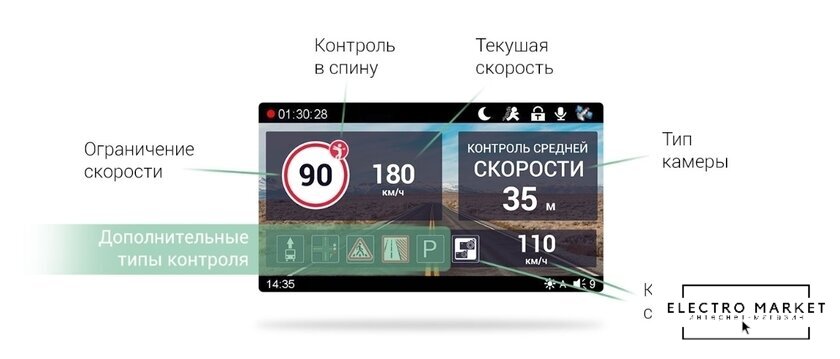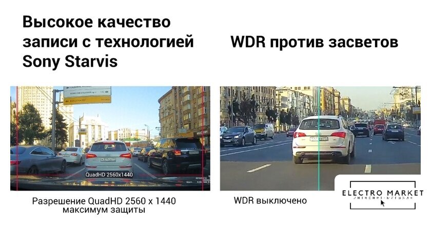 основная камера: 3.6 Мп 145°, вторая камера: 2 Мп, видео 2560x1440 H.264, GPS, G-сенсор, экран 2"