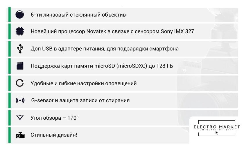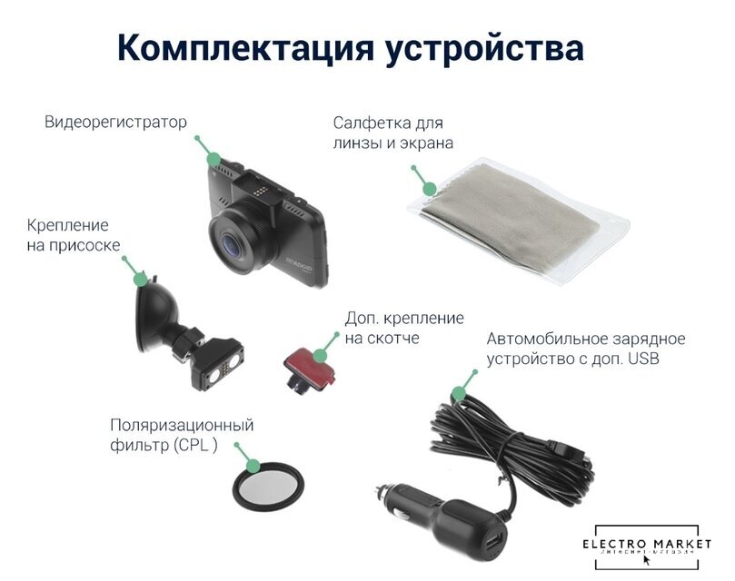 Комплектация | - видеорегистратор;- поляризационный фильтр (CPL);- крепление на присоске;- доп. крепление на 3М скотче;- автомобильное зарядное устройство;- салфетка для линзы и экрана. |