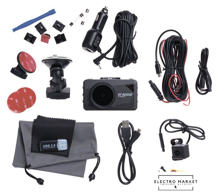 Комплектация | - Адаптер питания с доп. USB;- Крепление на присоске;- Крепление на 3М скотче;- USB-кабель;- Предохранители к АЗУ (2шт);- Поляризационный фильтр;- Мешочек для хранения;- Клипсы для провода зарядного устройства;- Лопатка для провода зарядного устройства;- Камера заднего вида;- Кабель для камеры заднего вида 5.5м;- Кабель для камеры заднего вида 0.5м. |