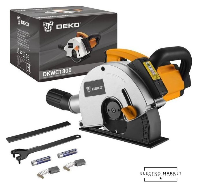 Комплект поставки | - Штроборез электрический - 1 шт.- Алмазный диск (установлен) - 2 шт.- Ключ фланцевый- Долото лопаточное- Батарейки для лазера - 2шт.- Инструкция- Коробка |