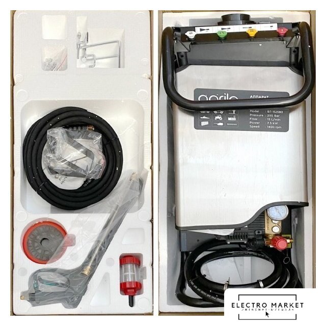 Комплектация | пистолет с термостойким удлинениемшланг высокого давления длиной 10 мшланг забора воды из ёмкости длиной 3 м фильтр тонкой очистки |