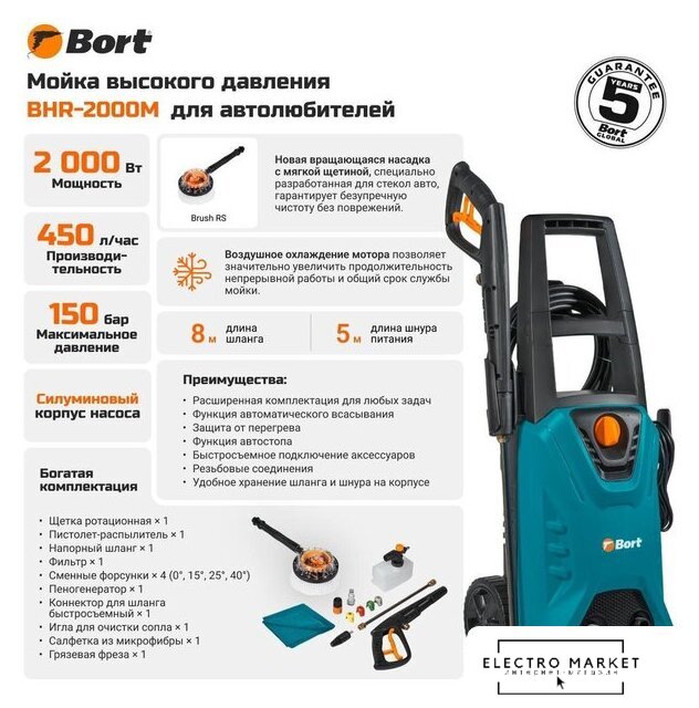 2200 Вт, 450 л/ч, максимальное допустимое давление: 150 Бар, длина шланга: 5 м