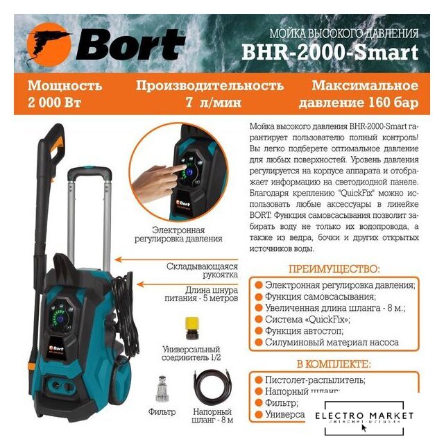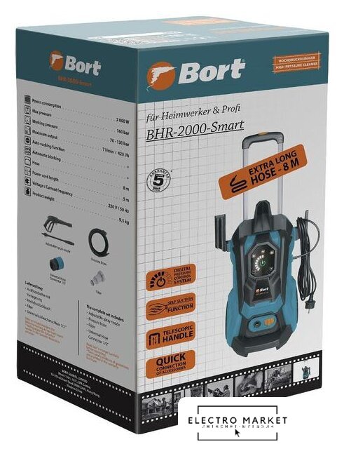 2200 Вт, 450 л/ч, максимальное допустимое давление: 150 Бар, длина шланга: 5 м