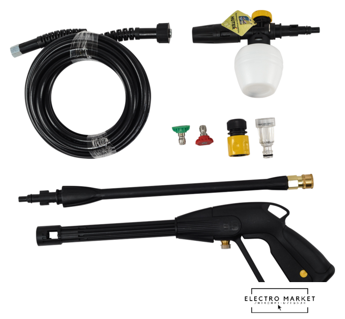Комплектация | - Мойка высокого давления;- Пистолет-распылитель разборный;- Шланг высокого давления;- Игла для очистки сопла;- Фильтр;- Быстросъёмный коннектор для шланга подачи воды;- Руководство по эксплуатации. |