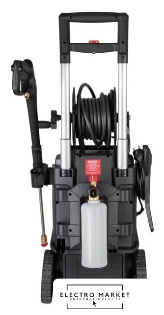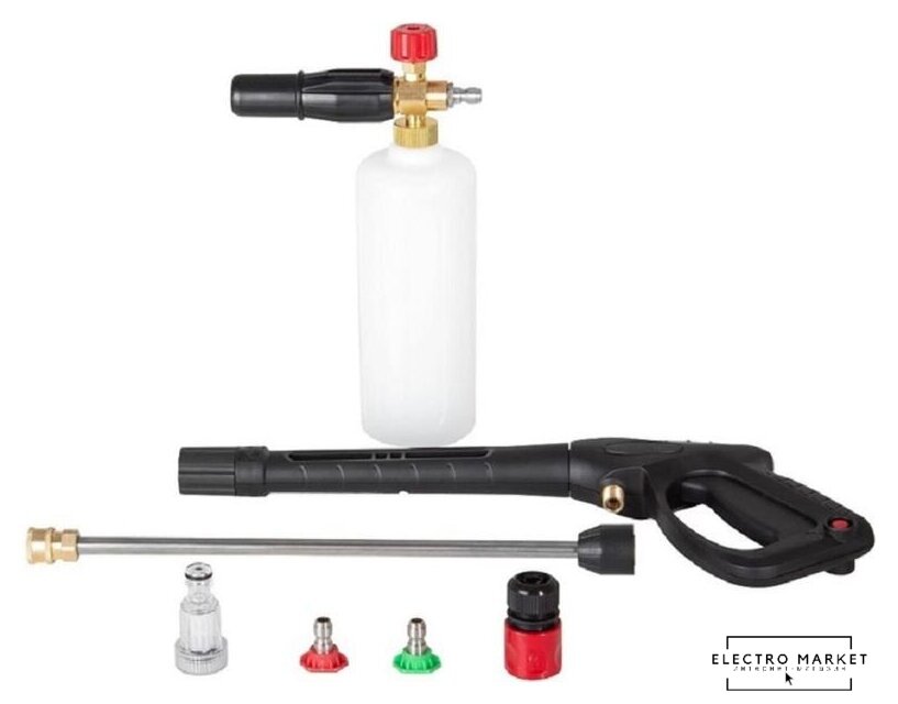 | Комплектация | - Мойка высокого давления;- Пистолет-распылитель разборный;- Шланг высокого давления;- Пеногенератор;- Игла для очистки сопла;- Сменные форсунки;- Фильтр;- Быстросъёмный коннектор для шланга подачи воды;- Руководство по эксплуатации;- Упаковка. |