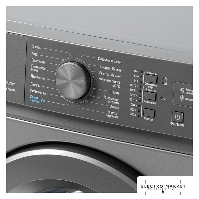 | Все программы | Хлопок, Деликатная, Интенсивная, Смешанные ткани, Быстрая 42/15 мин, Холодная стирка 20°С, Отжим, Шерсть, Полоскание и отжим, Очистка барабана, ЭКО, Детская, Постельное белье, Спортивная, Стирка с паром |