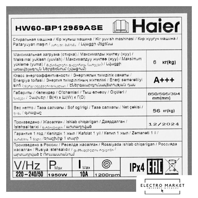 Изготовитель: ХАИЕР ЕЛЕЦТРИЦАЛ АППЛИАНЦЕС ЦОРП. ЛТД. Группа Хаиер,индустриальный парк Хайер, нет 1, Хаиер дороги, зоны высоких технологий, 266101, Циндао, КНР