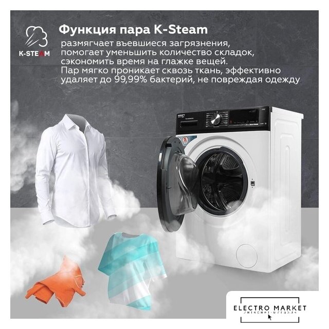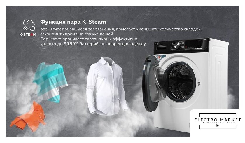 | Оригинальные функции | K-Steam (обработка паром), K-SMART (автовзвешивание), Aqua Stop (защита от протечек) |