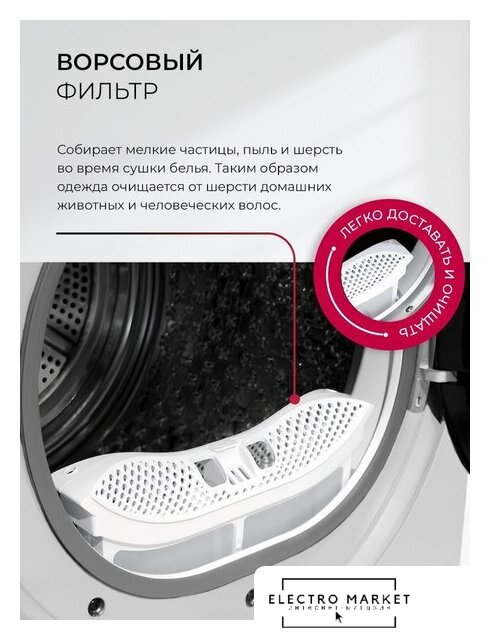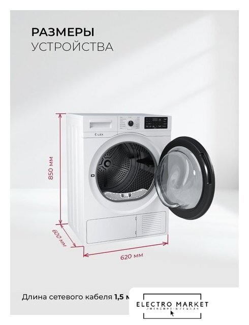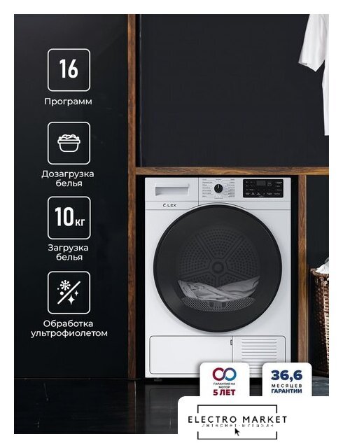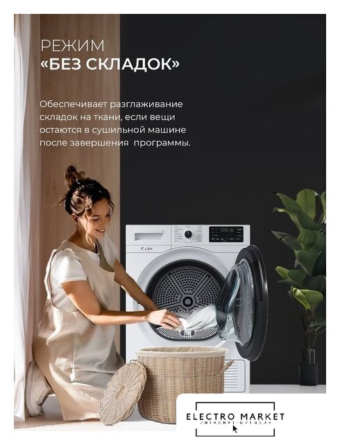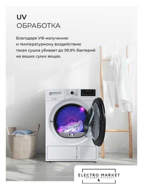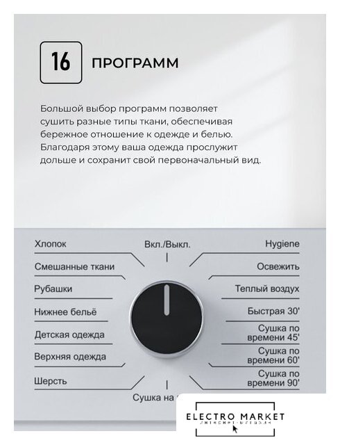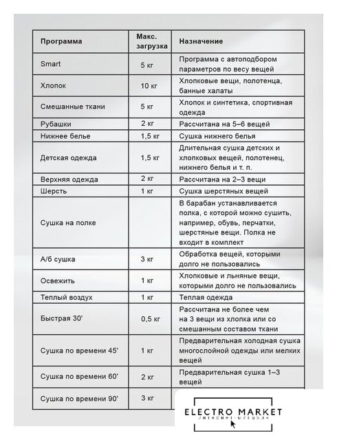 | Все программы | Smart: Автоподбор параметров.Хлопок: Для полотенец и халатов.Смешанные ткани: Хлопок и синтетика.Рубашки: До 5-6 рубашек.Нижнее белье: Для белья.Детская одежда: Для детских вещей.Верхняя одежда: Для пуховиков.Шерсть: Для шерстяных вещей.Сушка на полке: Для обуви.Освежить: Удаление пыли.Быстрая 30′: Для 3 вещей.Сушка по времени: 45′, 60′, 90′. |