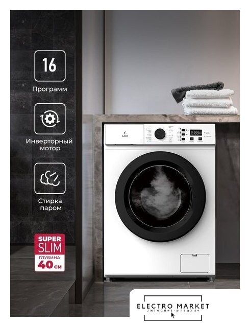 отдельностоящая, стиральная машина, с паром, загрузка до 6 кг, отжим 1000 об/мин, глубина 42.5 см, энергопотребление A, 16 программ