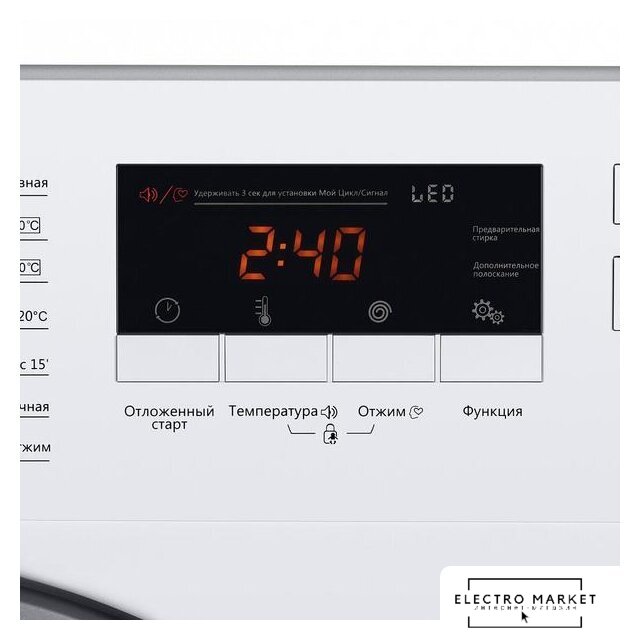 Все программы | Мой режимХлопок интенсивнаяХлопок 60°Хлопок 40°Хлопок 20°Экспресс 15'РучнаяПолоскание и ОтжимОтжимСливШерстьДеликатнаяСмешанные тканиСинтетикаСпортивная одеждаДетская одежда |