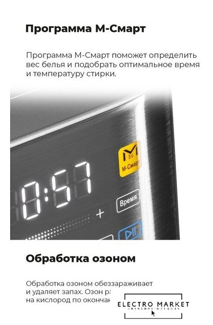 Оригинальные функции | М-Смарт - поможет определить вес белья и подобрать оптимальное время и температуру стирки. |
