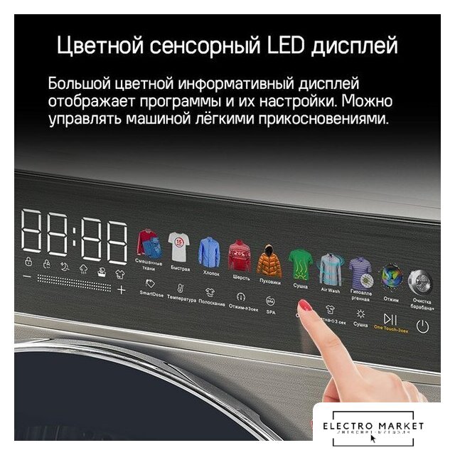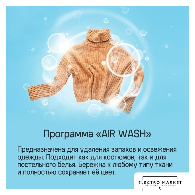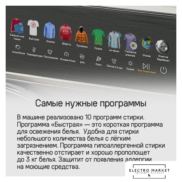 | Все программы | Смешанные тканиБыстраяХлопокШерстьПуховикиСушкаAir WashГиппоаллергеннаяОтжимОчистка барабана |