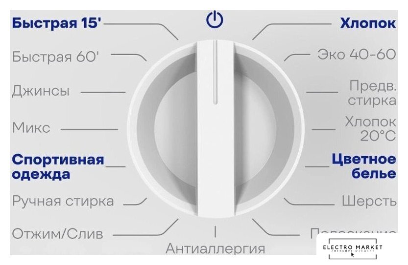 | Все программы | быстрая 15 минут, быстрая 60 минут, хлопок, ЭКО 40-60°C, хлопок 20°C, цветное белье, шерсть, ручная стирка, антиаллергия, спортивная одежда, микс, джинсы, предварительная стирка, полоскание, отжим/слив |