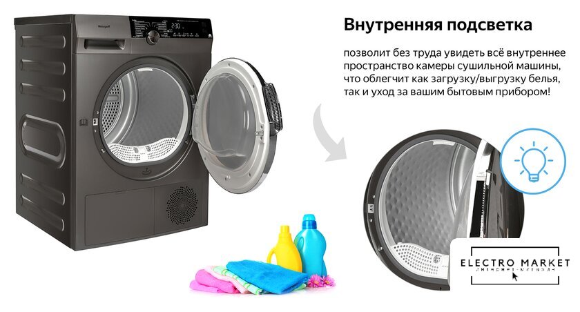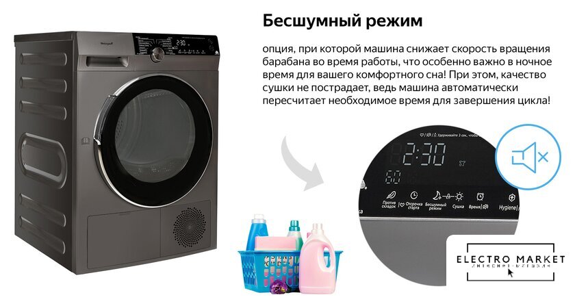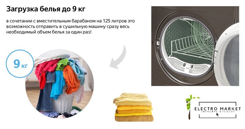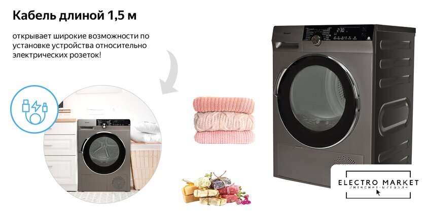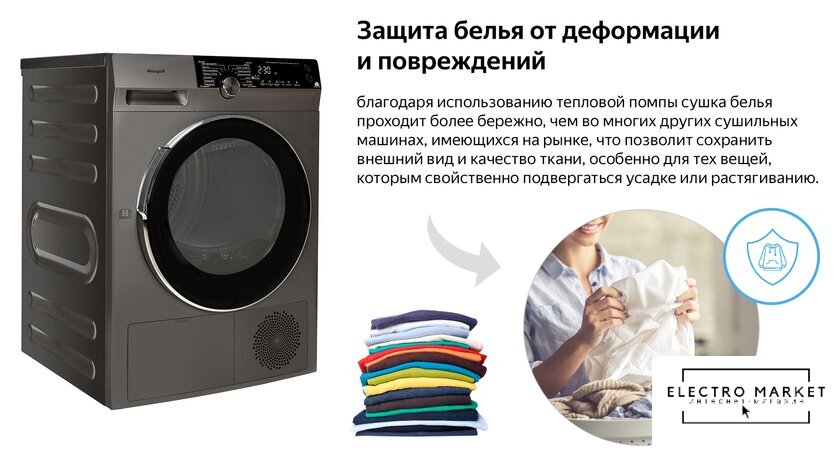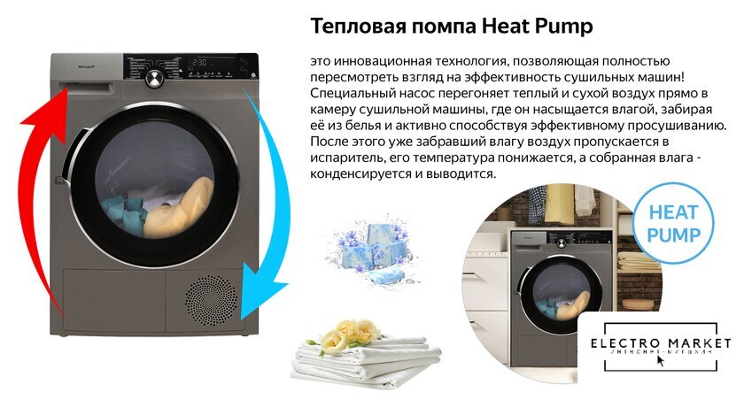 отдельностоящая, сушильная машина, сушка: конденсация с тепловым насосом, загрузка до 9 кг, глубина 63.6 см, энергопотребление A++, 15 программ
