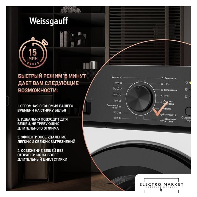 Все программы | Хлопок / 20 °C, 40 °C, 60 °C, 90 °C, Быстрая 15", Смешанные ткани / холодная, 40 °C, 60 °C, Синтетика / холодная, 40 °C, Деликатная / холодная,20 °C,Очистка барабана, Отжим, Полоскание+ отжим |